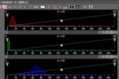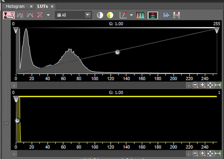| Equalize Intensity | Corrects intensity levels based on whole z stack or multiple point. Can choose to correct with respect to the histogram of the first frame or by histogram stretching to enhance dynamic range. Also includes options for how to determine the intensity limits: can choose minimal intensity or zero value for the bottom, and either mean intensity or a specified quantile of intensity for the top. Selected histogram stretching from minimal intensity to mean intensity, which enhanced the dynamic range as shown on the histogram:  |