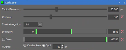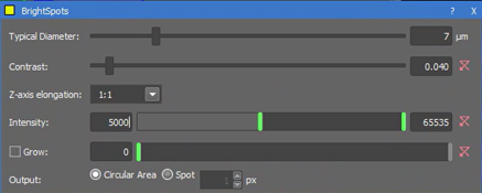 | Bright Spots (3D) | A thresholding method that looks for bright spots on a dark background. Can adjust several parameters to refine the filter and choose the binary output to be areas of the threshold diameter or spots of a specified width.